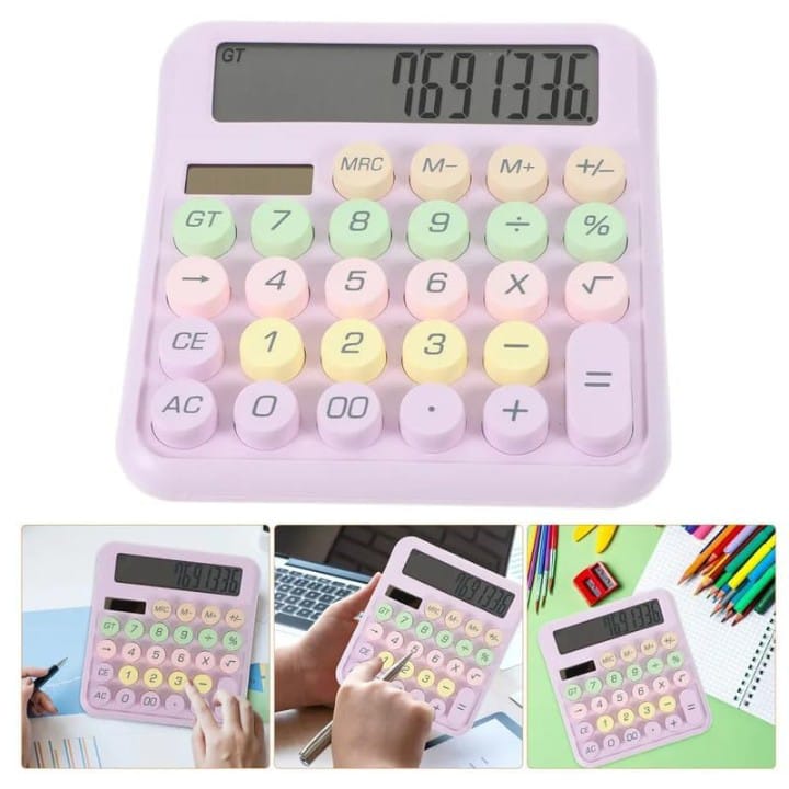 This is a cute pastel-themed desktop calculator designed for students, kids, and office use. It features soft-color round buttons, a large clear digital display, and a compact, lightweight body. The calculator supports basic arithmetic operations like addition, subtraction, multiplication, division, percentage, and memory functions. Its attractive design makes it perfect for study desks, school bags, or office tables.
